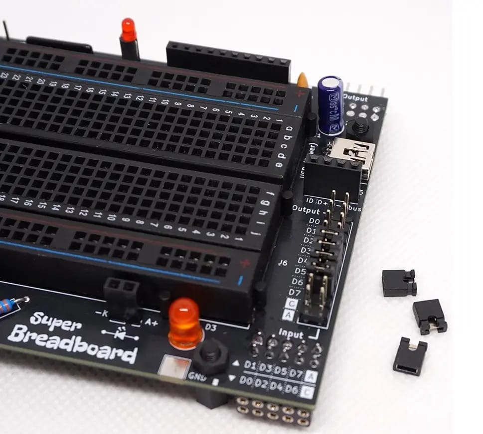 Featuring short circuit protection and selectable +3.3V or +5V power from USB or external sources, this breadboard separates data input and output and comes with a built-in button and LED. You can add an 8-bit LED display and binary keyboard for interactive microprocessor learning, plus chain multiple boards for bigger projects.