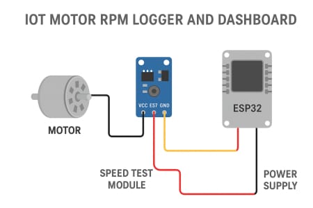 By counting sensor pulses triggered by a motor’s rotating code disc, a microcontroller calculates RPM and shares the data both on a local screen and through a WiFi dashboard.