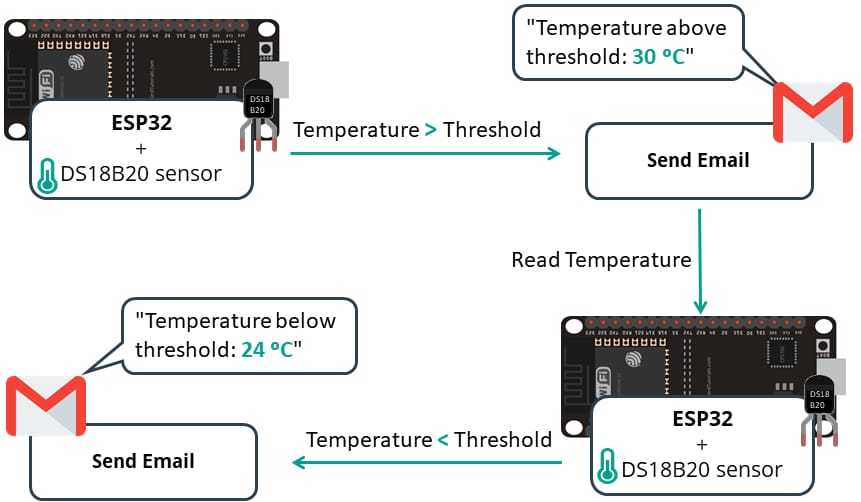 Set up an ESP32 web server to adjust settings, view sensor data, and send email alerts when specific temperature thresholds are hit.
